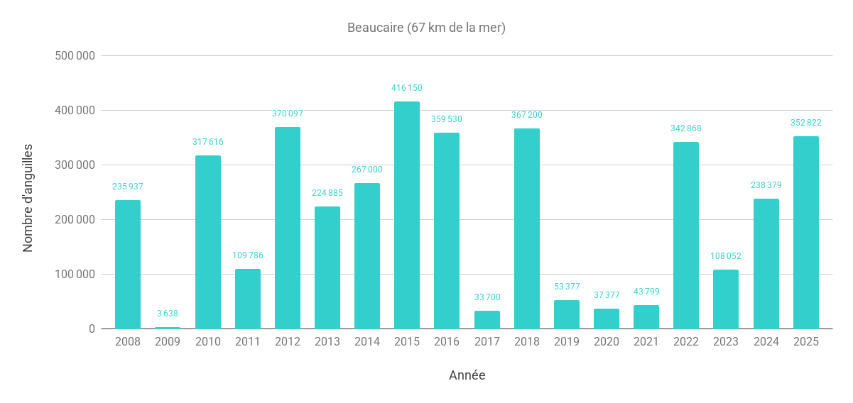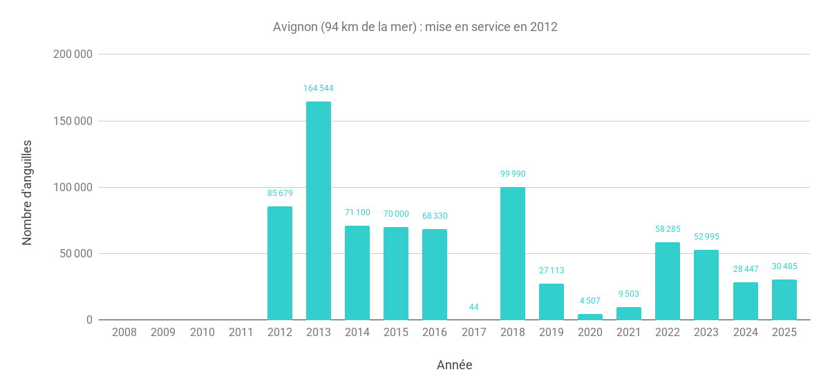Les effectifs d’anguillettes comptabilisés en 2025 sont en légère hausse par rapport aux années précédentes : 383 544 individus, dont 383 307 sur l’axe Rhône au niveau des barrages de Beaucaire (352 822 individus) et Avignon (30 485 individus). 237 individus ont été contactés sur la Durance à Mallemort. Les effectifs comptabilisés à Beaucaire sont au-dessus de la moyenne, mais ceux comptés à Avignon sont faibles en comparaison de la chronique de suivi (206 977 individus en moyenne à Beaucaire et 56 999 en moyenne à Avignon).