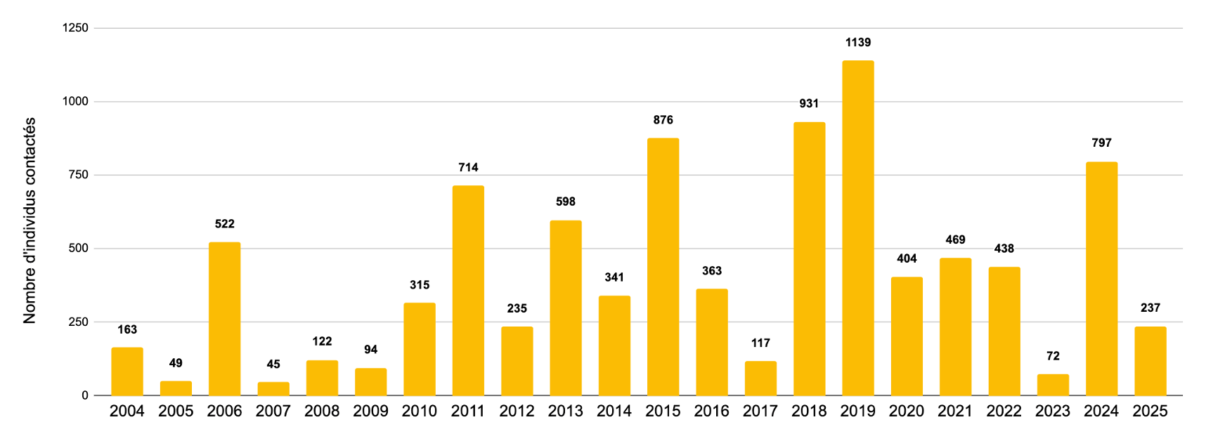 L’évolution des effectifs comptabilisés sur ce dispositif est donc plutôt représentative d’un état initial, en prévision de l’amélioration de la franchissabilité des obstacles en aval dans les années à venir. A noter que les travaux de restauration de la continuité écologique des ouvrages 68, 67 et 66 se sont achevés à l’été 2025, les années qui arrivent pourraient alors permettre de voir un sursaut.