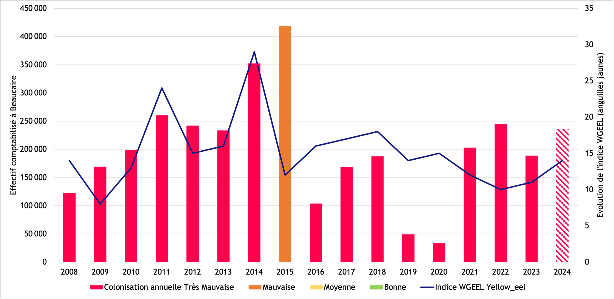 Un indicateur anguillette, concernant spécifiquement les captures effectuées au niveau de l’ouvrage de Beaucaire a été mis en place en 2023.